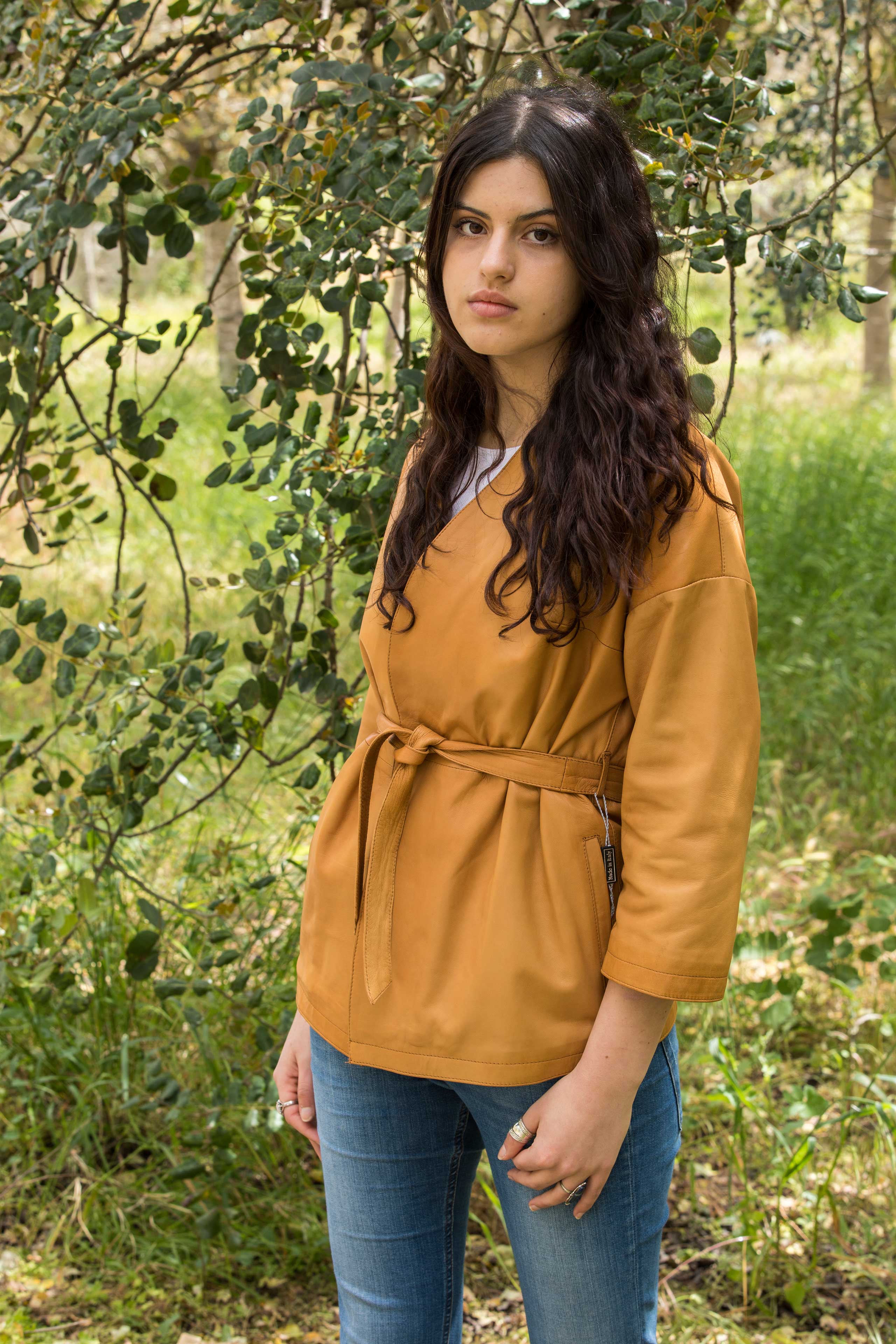 Donna Autunno Pelle Beige Giacca kimono in nappa naturale cuoio Cintura a fusciacca in vita Tasche laterali Vestibilità comoda Contattaci per avere informazioni